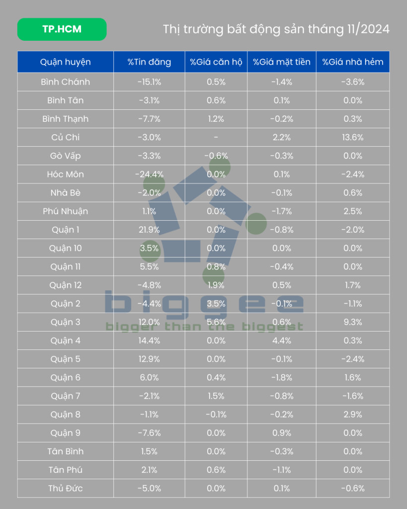 Tháng 11/2024, thị trường bất động sản tại Việt Nam đang tiếp tục diễn biến tích cực với một số tín hiệu đáng chú ý. Nổi bật là tình hình giá chung cư tại Hà Nội và TP.HCM có xu hướng tăng trở lại. Dù bảng giá đất mới tại TP.HCM đã chính thức áp dụng từ đầu tháng, thực tế cho thấy chưa có sự bứt phá mạnh mẽ trong giá nhà đất ngay lập tức.